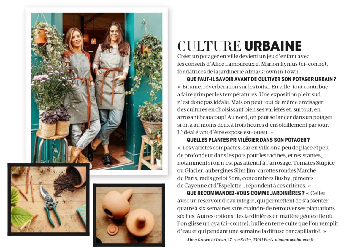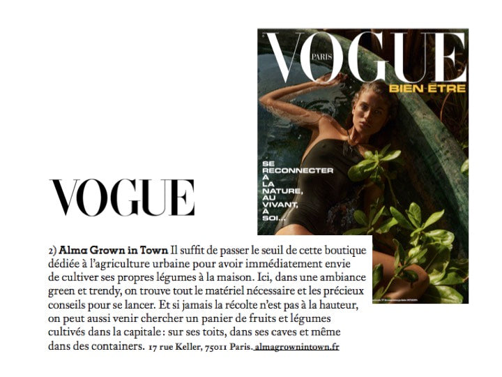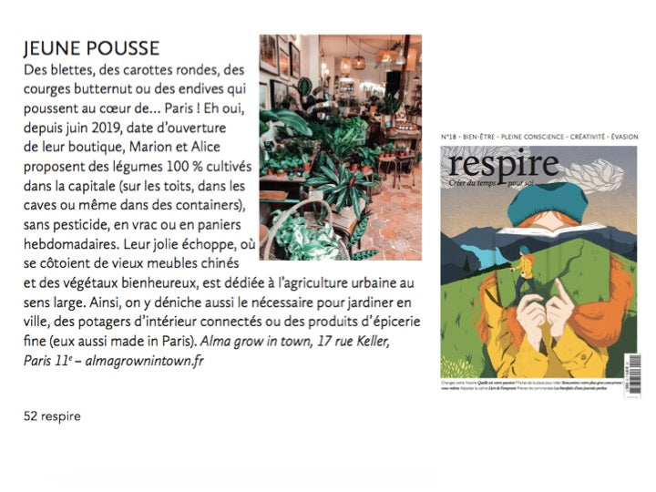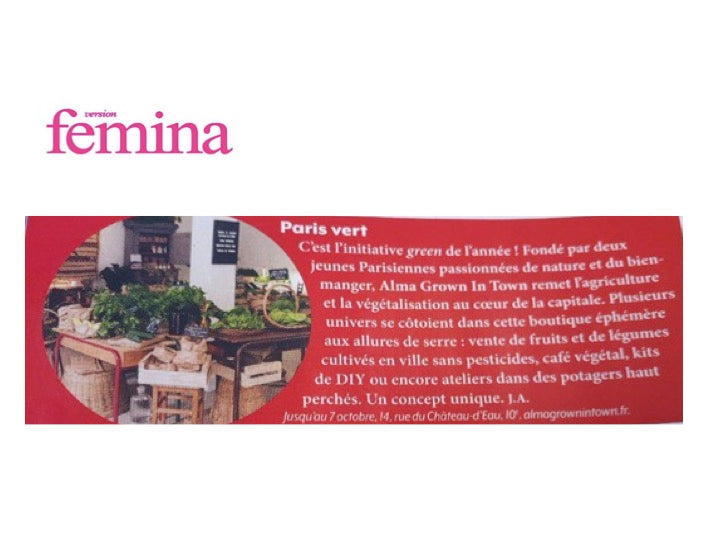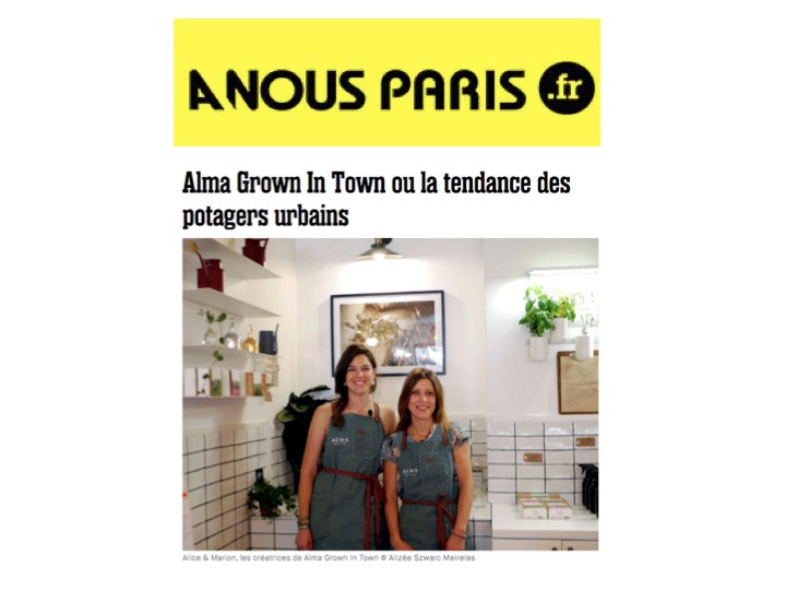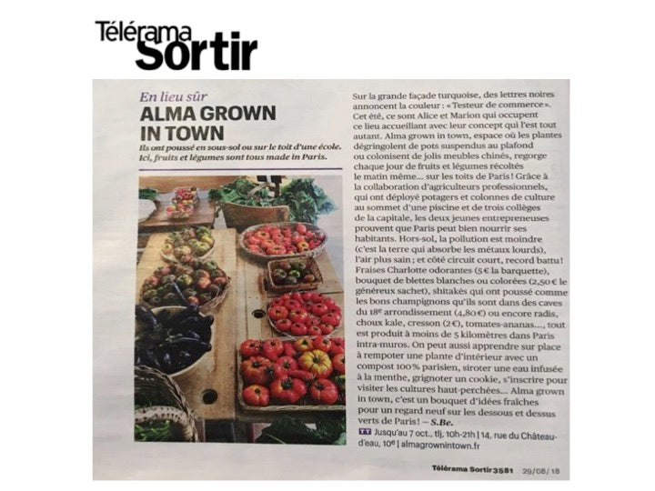 "C'est l'initiative green de l'année ! Fondé par deux jeunes Parisiennes passionnées de nature et de bien-manger, ALMA Grown in town remet l'agriculture et la végétalisation au coeur de la capitale. Un concept unique."